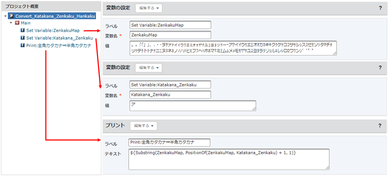 カタカナは半角文字と全角文字が文字コード上で対応する並びになっていないため、英数字のように16進数の足し引きで変換することが不可能です。そのため、マッピングを作成する必要があります。