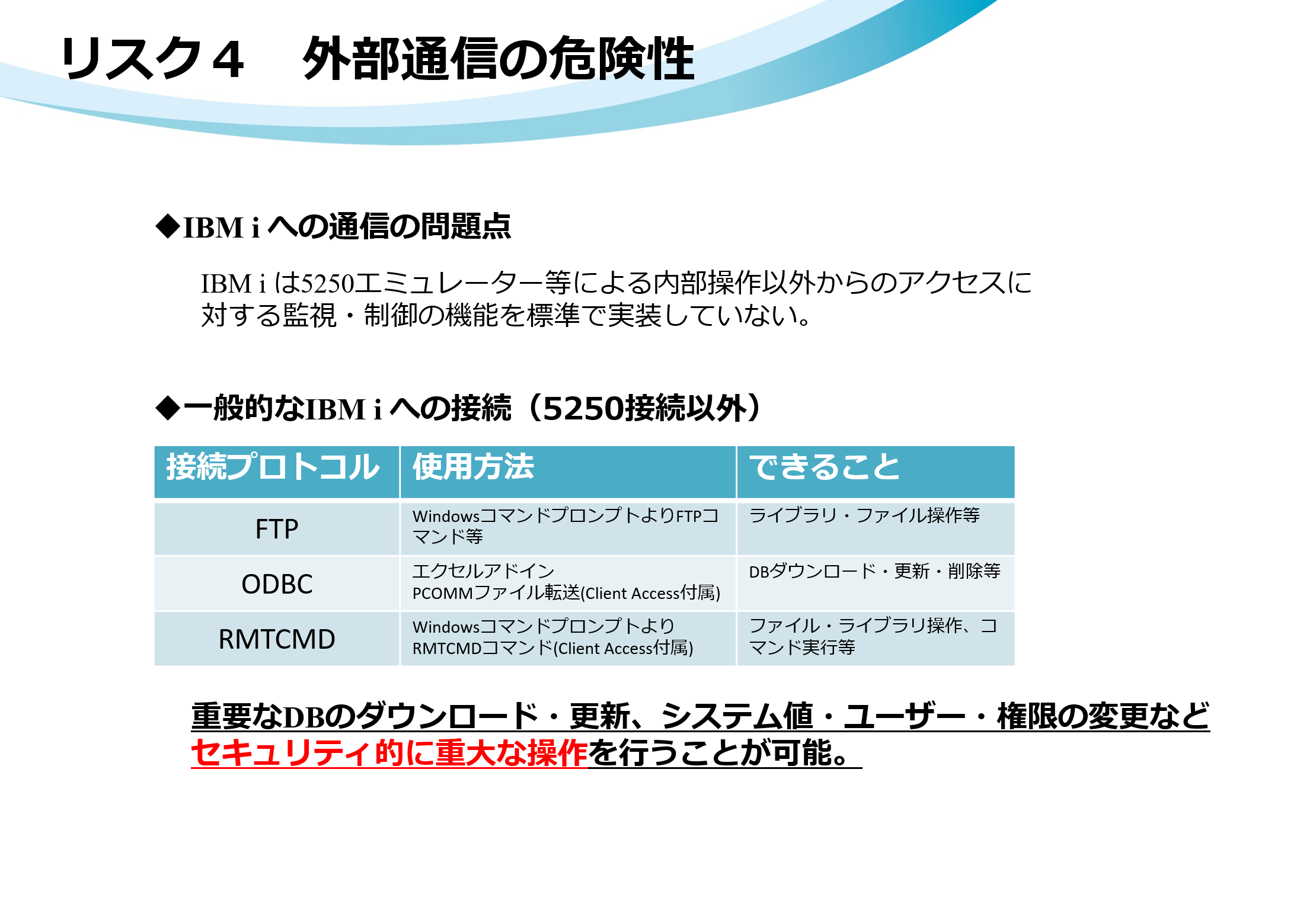 上記の例を含めて、5250接続以外にIBM iへの接続方式として一般的なものとして、FTP、ODBC、RMTCMD等が挙げられますが、これらはいずれも、状況と利用次第によっては重要なデータのダウンロードや更新、システム値やユーザー権限の変更など、セキュリティ的に重大な操作を行うことが可能です。