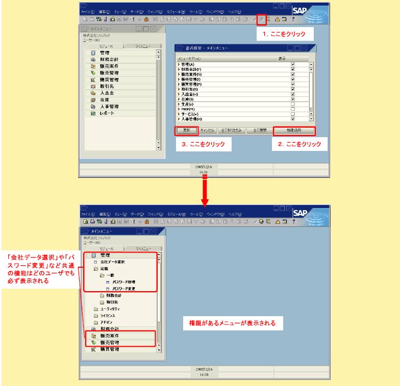 SAP Business One標準機能のアクセス権限の管理は『ユーザ権限』画面で行います。『ユーザ権限』画面を開くには、メインメニューの「管理→システム設定→ユーザ権限→一般権限」をクリックします。