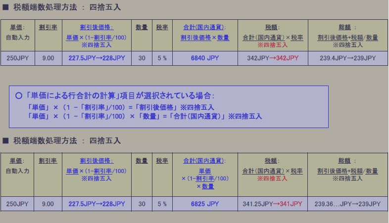 そのほか、伝票上で使用している価格表が純額価格表(税抜価格表)か総額価格表(税込価格表)か(8.1 (7)参照)、また、『伝票設定』画面/『一般』タブの「行ごとに税額の端数を処理」項目が選択されているかなどが、伝票上の「単価」、「総額」、「合計(国内通貨)」、「税額(国内通貨)」、「割引前価格」、「税額」、「合計」項目の値に影響します。これらの設定の組み合わせパターンは後述します。