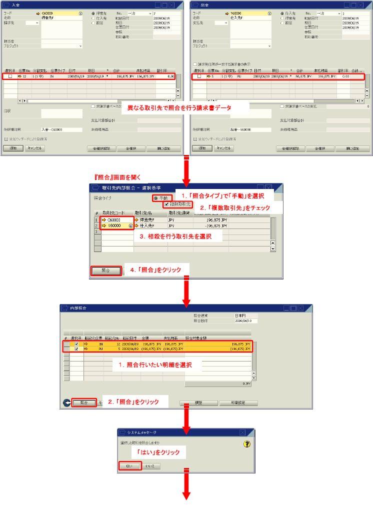 得意先から入金があったものの、どの請求書に対する入金なのかわからない等の理由で『入金』画面から非請求書ベースで入金し(10.4参照)、後日どの請求書かが判明した場合、「取引先→内部照合→照合」から非請求書ベースの入金データと請求書を照合させることができます。非請求書ベースの入金データと請求書を照合させると、お互いの金額が相殺されて『入金』画面に表示されなくなります。