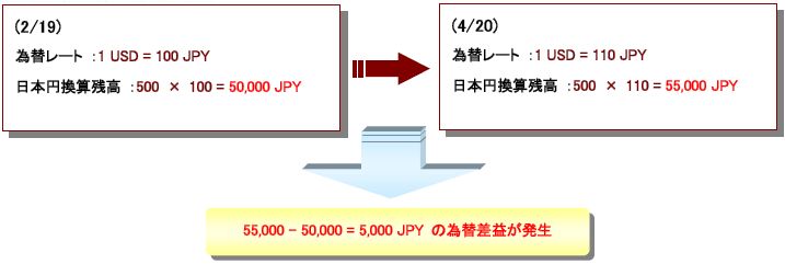 先程入力した売掛請求書のレートは1USD = 100JPYですので、債権(売掛金)の日本円換算金額は、計上金額(USD)×為替レート(100JPY/USD)となります。しかし、為替レートは日々変動しています。入金、支払時に、為替レートが仮に1USD = 110JPYの場合、先に計上された金額は日本円に換算すると計上金額(USD)×為替レート(110JPY/USD)となり、結果として(計上金額(USD)×為替レート(110JPY/USD))-(計上金額(USD)×為替レート(100JPY/USD))の為替差益が発生することになります。