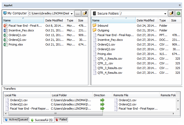 セキュアフォルダ内のオプションのアプレットインターフェースは、ブラウザ内で一度に複数のファイルを転送する際に有用な、Javaアプレットとして実行されます。