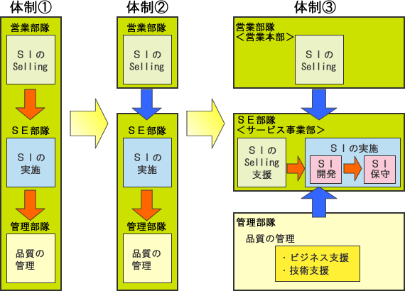 組織の変革 ⇒ 品質管理部隊の組織化 組織の改革のために、品質管理部隊の組織化を、サポートします。 管理を分離し、品質をチェックする仕組みを 強化することでサービスレベルの向上を実現します。
