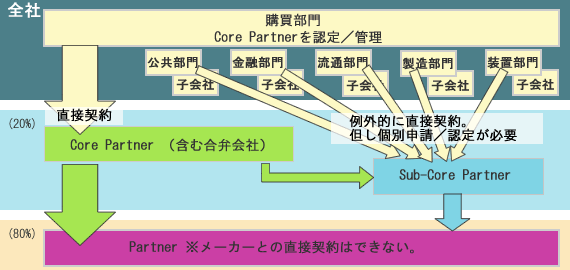 Business Partner をその会社のスキル、規模(従業員数)、得意技、実績の評価(Revenue、品質&)等の観点より、(1)Core Partner、(2)Sub-Core Partner、(3)Partner に選別し、管理する。