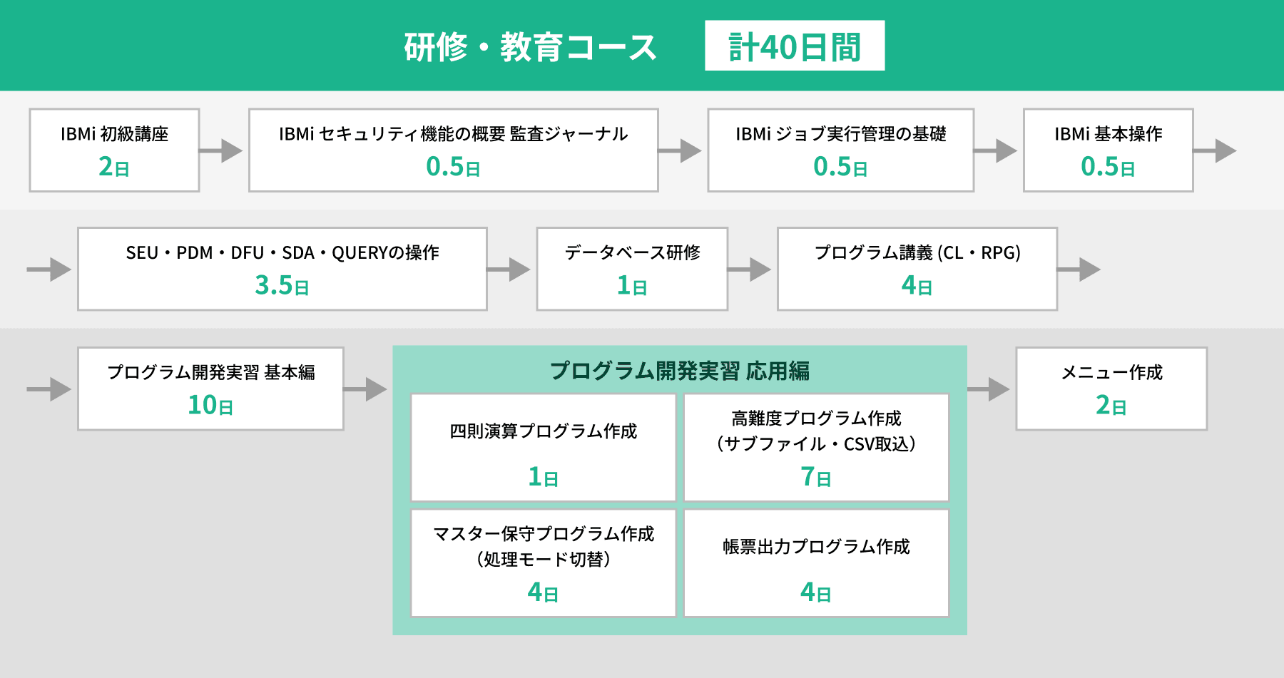 プログラミング未経験者でも基本用語の理解・RPGプログラム開発ができるようになることを目標とした研修です。